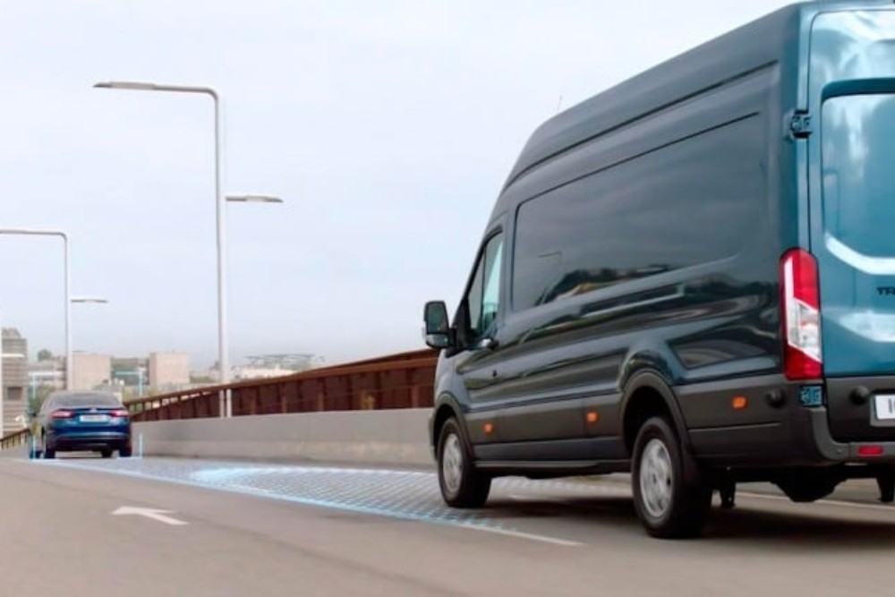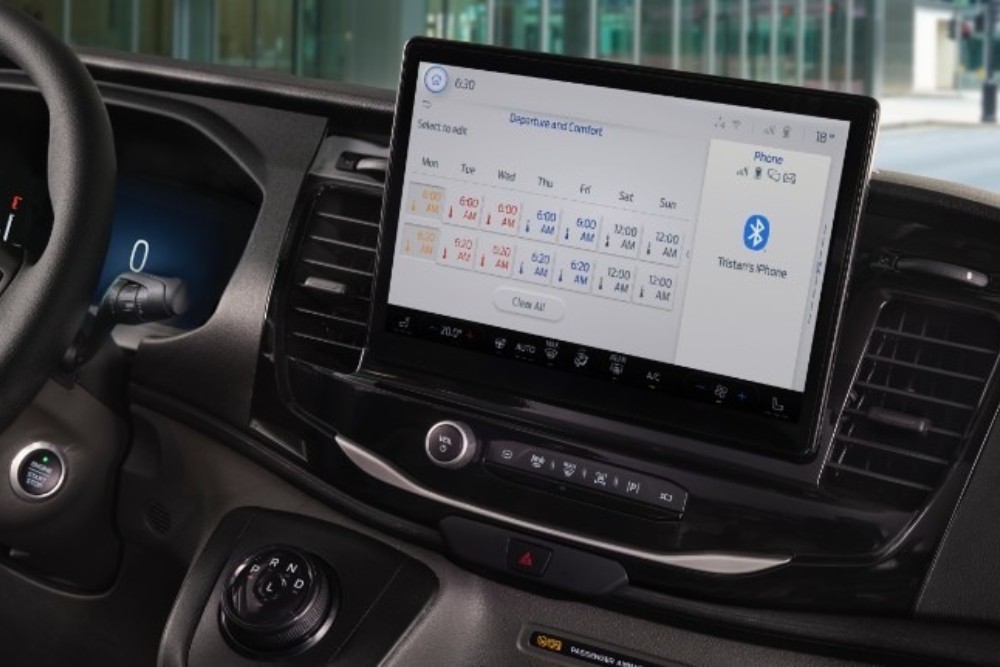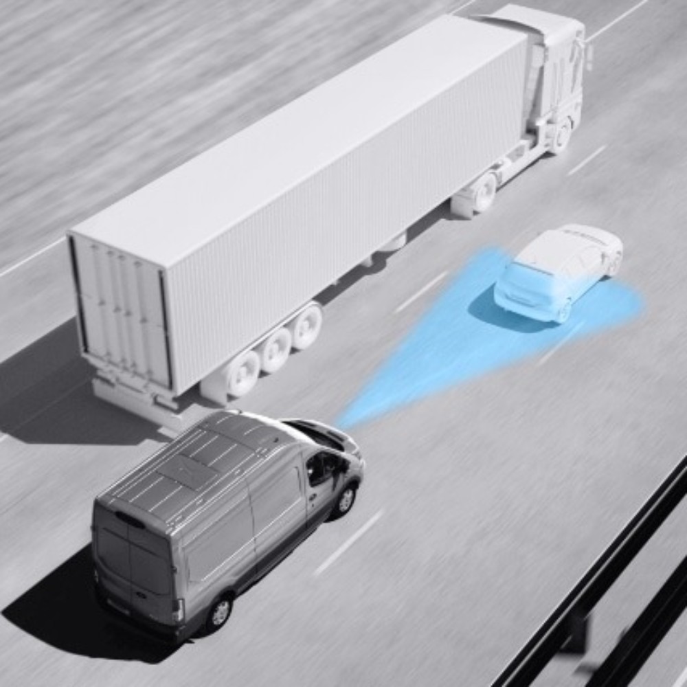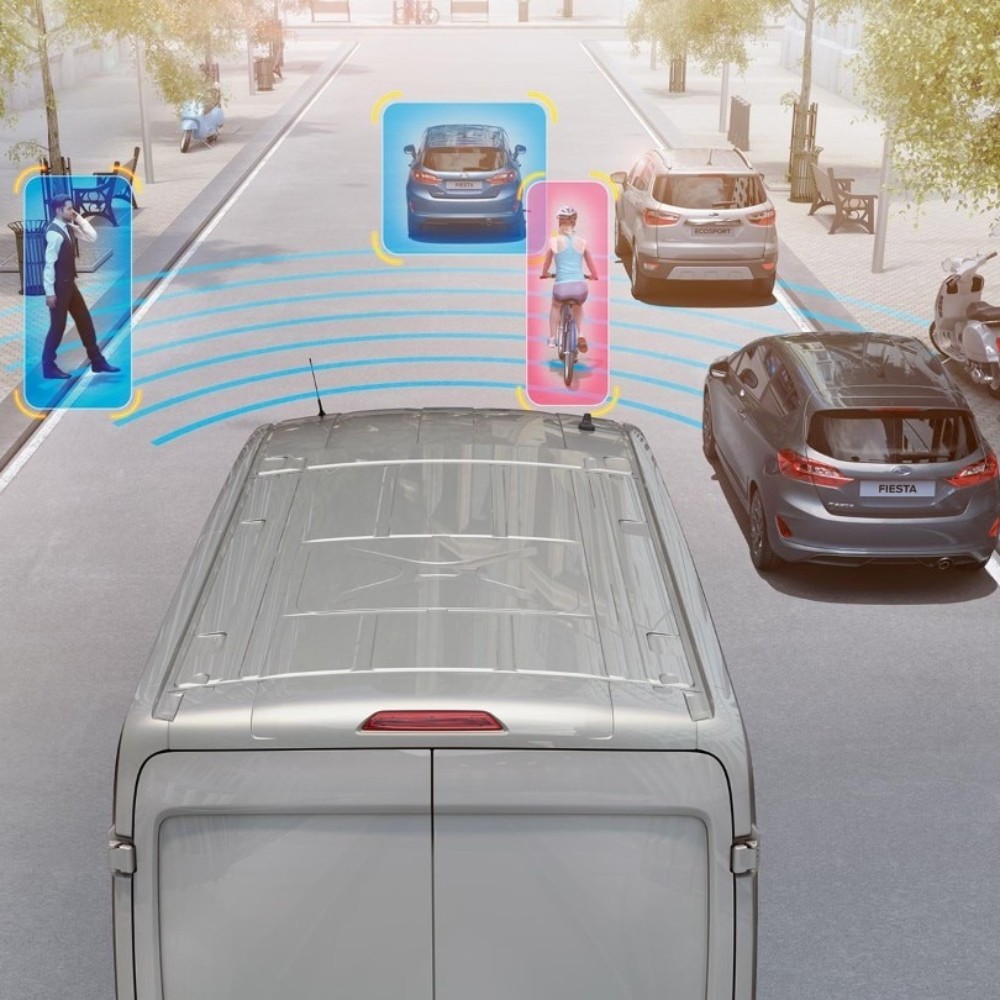 Le dotazioni tecnologiche di serie del Ford Transit includono il Cruise Control (incluso Lane-Keeping Alert & Aid e Intelligent Speed Assist), Pre-Collision Assist con frenata di emergenza automatica, e il sistema di monitoraggio della pressione degli pneumatici.