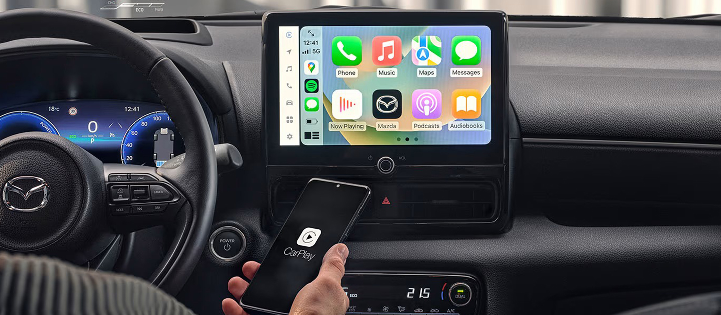 Il display di infotainment* da 10,5” di Mazda2 Hybrid è stato pensato per accedere a musica, app, chiamate e navigatore nel modo più semplice possibile mentre sei al volante; così potrai concentrarti su ciò che conta davvero: il piacere di guida.