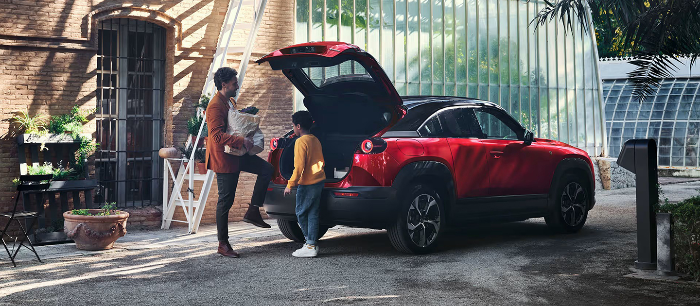 Mazda MX-30 R-EV supporta una ricarica CA veloce e una lenta, oltre a una ricarica CC rapida fino a 36 kW. È possibile riempire l’ampio serbatoio da 50 litri per ricaricare la batteria usando il motore rotativo a benzina, trasformandola così in un’auto ibrida plug-in con stazione di ricarica integrata. È compresa anche una presa di corrente CA da 1.500 W nel bagagliaio.